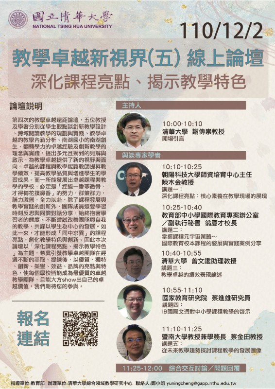 | 標題 | 清華大學訂於110年12月2日上午10點至12點,辦理「教學卓越的新視界(五):深化課程亮點、揭示教學特色」線上論壇 |