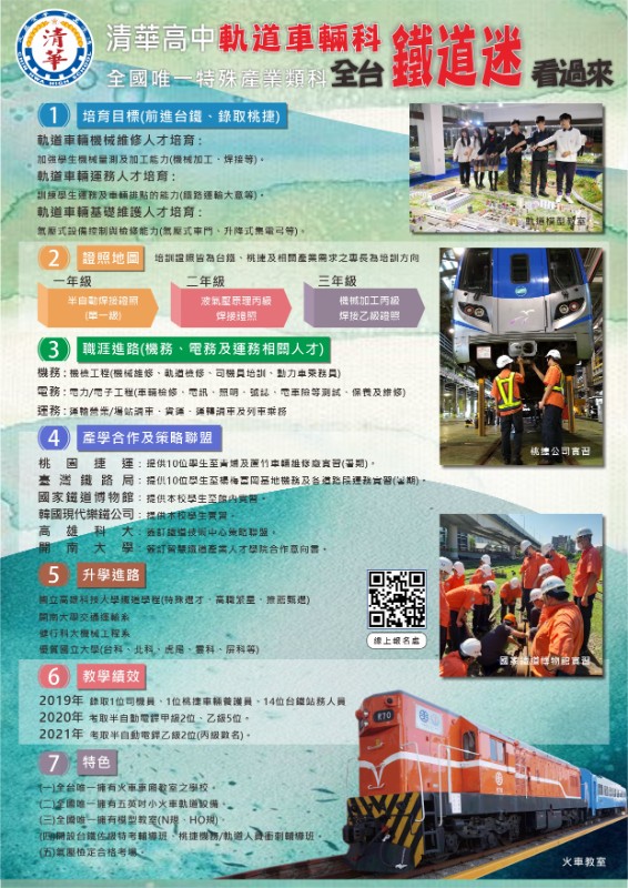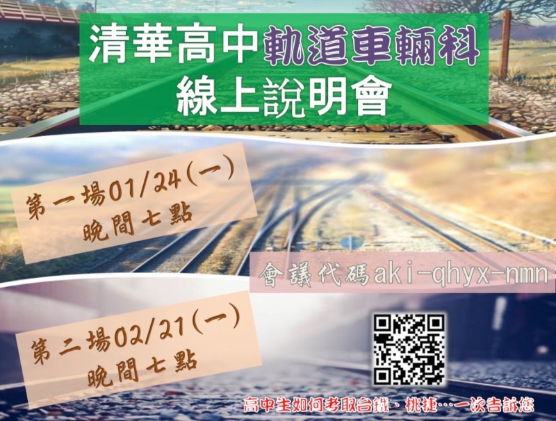 說明:一、本校開設全國唯一產業特殊需求類科「軌道車輛科」,學生就讀本科享有三年學雜費全免之補助。二、線上說明會時間(共二場次):(一)第一場:111年01月24日星期一晚間七點。(二)第二場:111年02月21日星期一晚間七點。三、線上會議代碼:aki-qhyx-nmn(須先申請google meet帳號才可登入會議)。四、承蒙惠允協助宣傳此案,其他相關事項,歡迎電洽本校教務處陳昭宏主任:(03)477