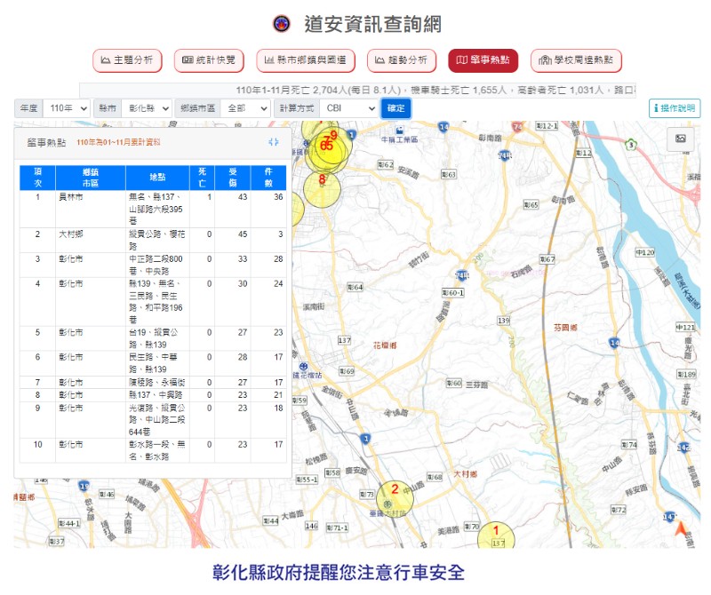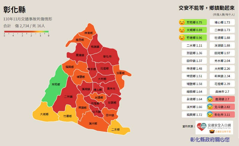 一、110年1月至11月與109年同期道路交通事故比較,死亡人數減少8人,受傷人數減少462人。期望縣民遵守交通規則,讓彰化縣事故零成長,彰化縣政府關心您。 |