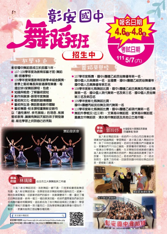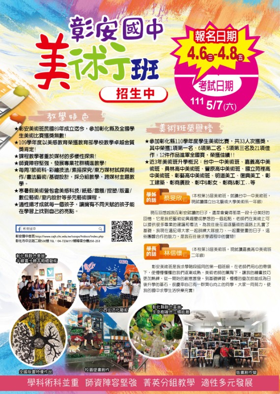 說明: 一、參加對象: (一)舞蹈班:本縣國民小學五、六年級,對舞蹈班有就讀意願之學生與家長。 (二)美術班:本縣國民小學五、六年級,對美術班有就讀意願之學生與家長。 二、活動時間:111年2月19日(星期六),詳細活動時間及流程如下。 (一)9:30-9:50 報到 (二)10:00-10:20 本校宣傳影片播放及校長致詞 (三)10:20-11:00 家長:舞蹈/美術班教學內容與課程規劃及招生鑑定說明,學生:多元媒材文創藝術體驗活動 (四)11:00-11:30 Q&A及環境參觀 三、報名時間:即日起至2月18日(五)下午16時止 四、報名方式:請至彰安國中學校網頁或FB粉絲專頁連結GOOGLE表單進行報名(https://forms.gle/VAFEiARLjaJgF5BQA),請務必填寫正確資料,以利後續聯繫。 五、防疫配套措施: (一)活動期間煩請全程配戴口罩,主動配合本校進行體溫測量及掃瞄場所代碼,若額溫超過37.5度,將提供書面資料,請勿進入會場。 (二)若受疫情影響無法辦理活動,將公告於本校網頁及FB粉絲專頁,並依GOOGLE表單報名所填之E-Mail資料,將相關活動宣導資料以E-Mail形式寄給家長參考。