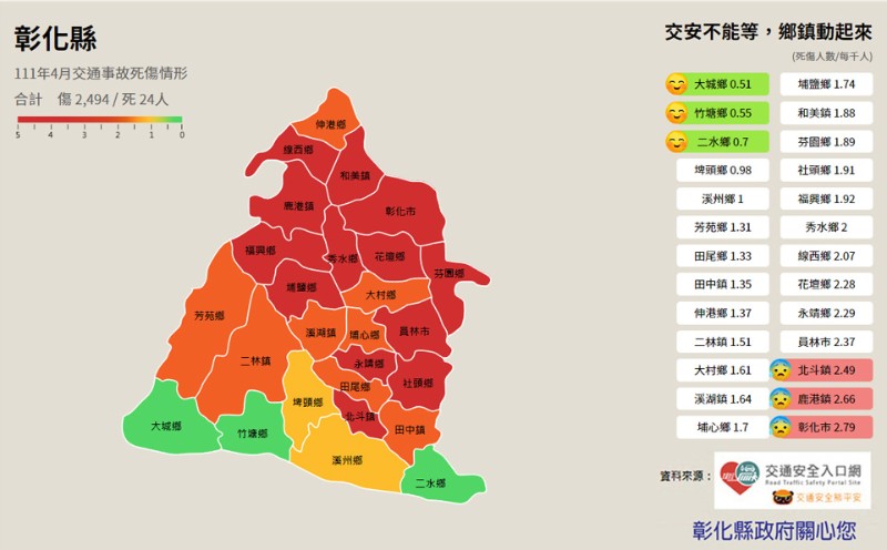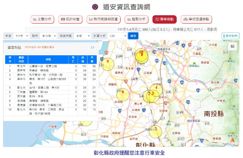 一、111年1-4月與110年同期道路交通事故比較,死亡人數增加18人,受傷人數減少89人,遠離大型車,才能確保自身安全,彰化縣政府關心您。 二、騎乘電動自行車請依號誌行駛。 三、車輛路口慢看停,行人路口停看聽。 四、注意車前狀況,請勿疲勞駕駛。