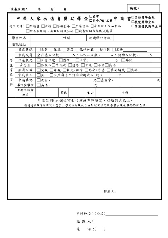 為協助家境清寒或家庭突遭變故之公私立高中/職、五專及公私立國中之學生能順利完成學業,另鼓勵弱勢學生特殊發展,特訂定「中華大家功德會獎學金」實施計畫(如附件)。 |