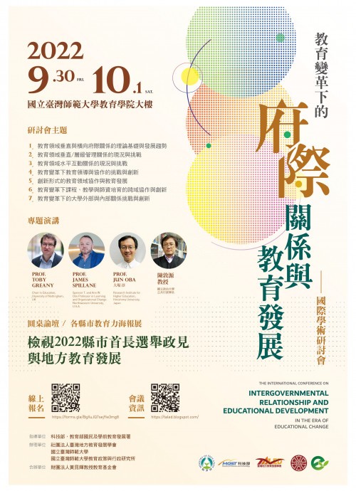 | 標題 | 轉知國立臺灣師範大學教育學系於111年9月30日至10月1日辦理「教育變革下的府際關係與教育發展國際學術研討會」報名海報乙份。 |