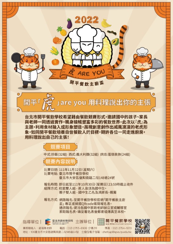 本屆比賽類別:分「中式炒飯」、「義大利麵」及「蛋糕裝飾」三項。藉由「開平『虎』are you」為主題,老虎具威風凜凜的大眾印象,如同開平餐飲培養自信餐飲人的目標,邀請喜愛餐飲的國中生,能內觀自身興趣發展,並依主題盡情發揮創意,以料理展現自我、創造未來無限可能。 |