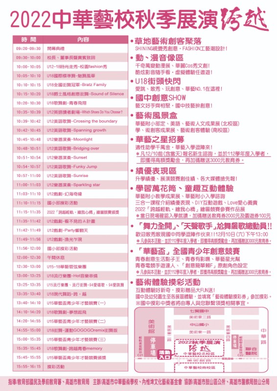中華藝校舉辦「2022秋季展演-跨越」活動,邀請學生參與,請查照。 |