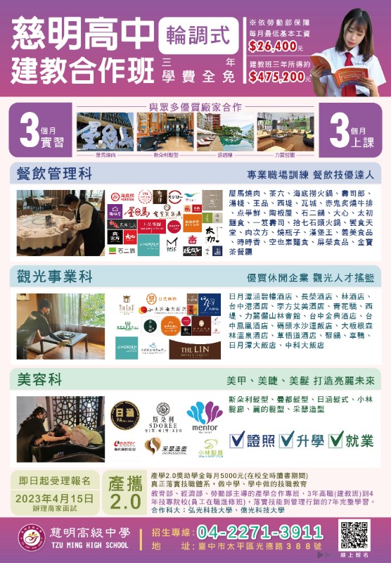 112學年度開設「餐飲管理科」、「觀光事業科」、「美容科」三類輪調式建教合作班。 |