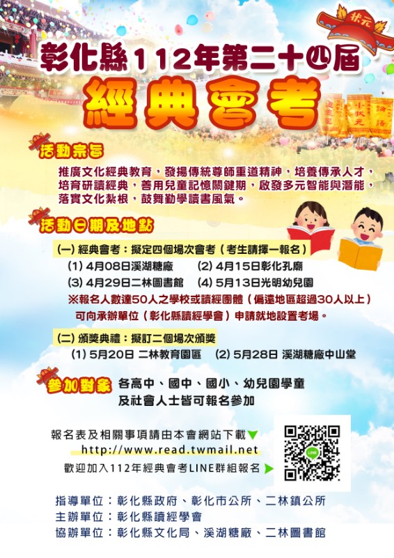 檢送彰化縣112年第二十四屆經典會考實施計畫、報名表及電子海報各1份。 |