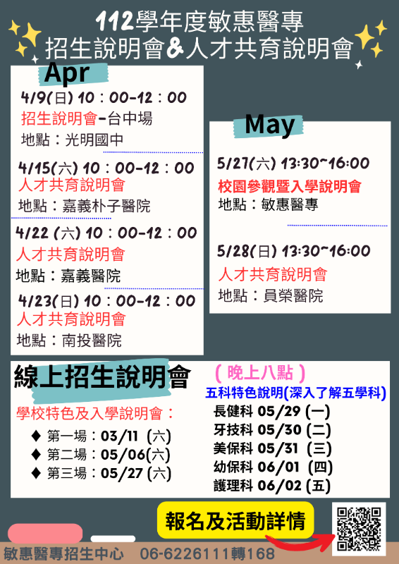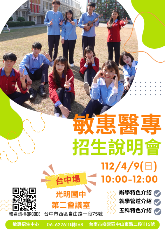 敏惠醫護管理專科學校辦理五專入學招生說明會網址連結,敬請踴躍報名參加。 |