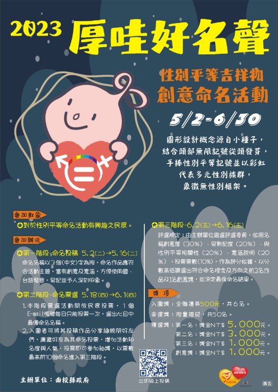 南投縣政府自112年5月2日起至6月30日止辦理性別平等吉祥物「厚哇好名聲」命名活動,歡迎踴躍參與。