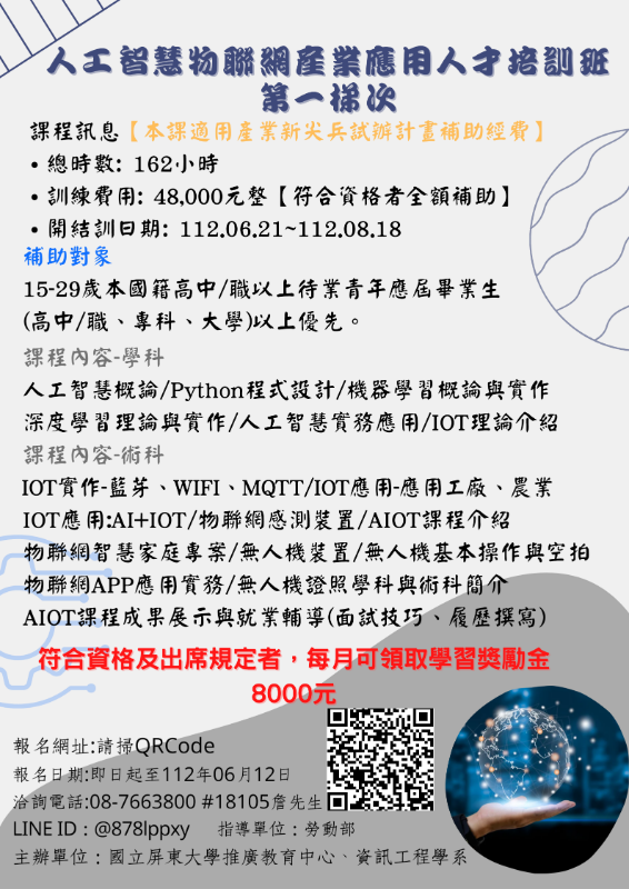 國立屏東大學辦理勞動部112年產業新尖兵試辦計畫課程「人工智慧物聯網產業應用人才培訓班」及「先進機械手臂機電整合與CNC工具機機械加工人才培訓班」,請貴校協助公告課程資訊,鼓勵學生、待業青年及校友踴躍報名參加,請查照。 |