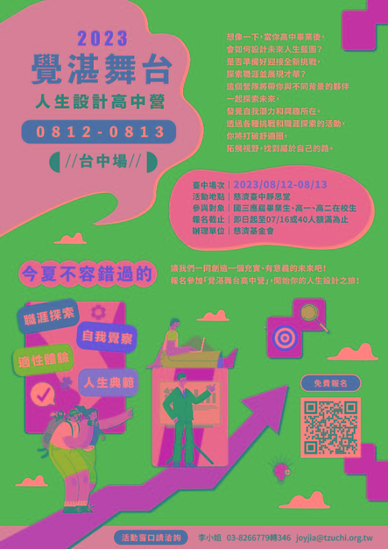 財團法人中華民國佛教慈濟慈善事業基金會舉辦2023年「覺湛舞台-人生設計高中營」台中場次活動簡章及活動海報,敬請公告並轉知貴校學生踴躍報名參加,請查照。 |