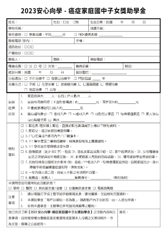 轉知財團法人臺灣癌症基金會辦理「2023安心向學-癌症家庭國中子女獎助學金」 |