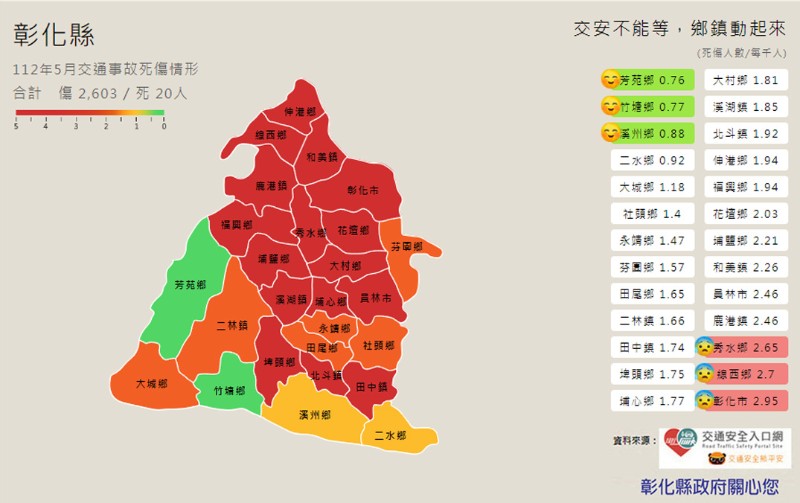 說明: 一、宣導標語: (一)112年1-5月道路交通事故死傷累計13,201人,為了您的安全,騎微型電動二輪車請戴安全帽,彰化縣政府關心您。 二、附件宣導圖為「112年1-5月交通事故死傷情形、鄉鎮市交通事故統計表、本縣各鄉鎮市30日死亡人數及事故與違規熱點」, 三、社群宣導:請見「花現彰化-彰化縣政府新聞處」(https://reurl.cc/ZW53Ll)臉書粉絲專頁。