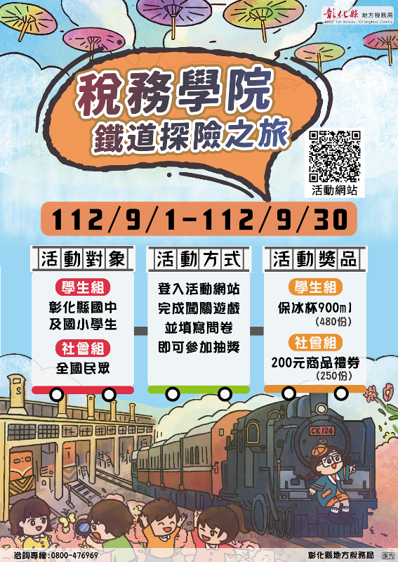 一、旨揭活動自112年9月1日至9月30日止,說明如下: (一)活動內容:活動期間內至活動網站,選擇參加組別並於線上展覽區學習租稅知識,完成稅務闖關且登錄個人基本資料後,即可參加抽獎。 (二)活動網站:https://reurl.cc/4oEE5j (三)活動對象 1、學生組:彰化縣所屬國中、國小學生。 2、社會組:全國民眾。 (四)活動獎項 1、學生組:保冰杯900ml計480名。 2、社會組:200元商品禮券計250名。二、活動詳情可參閱活動網站、本局官網活動訊息或粉絲團查詢,或撥本局免費服務電話0800-476969洽詢。