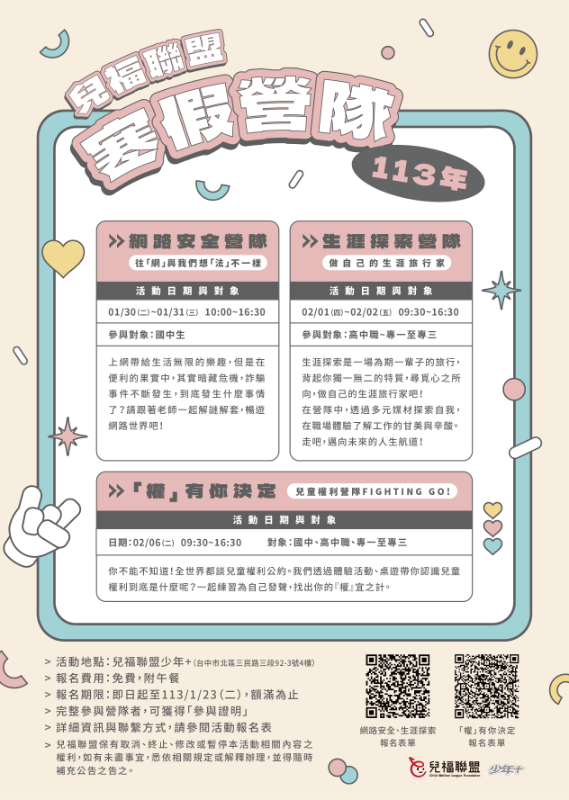 網路安全營隊、生涯探索營隊:兒福聯盟中區少年服務組黄思嘉社工,電話(04)2220-0128分機13。 |