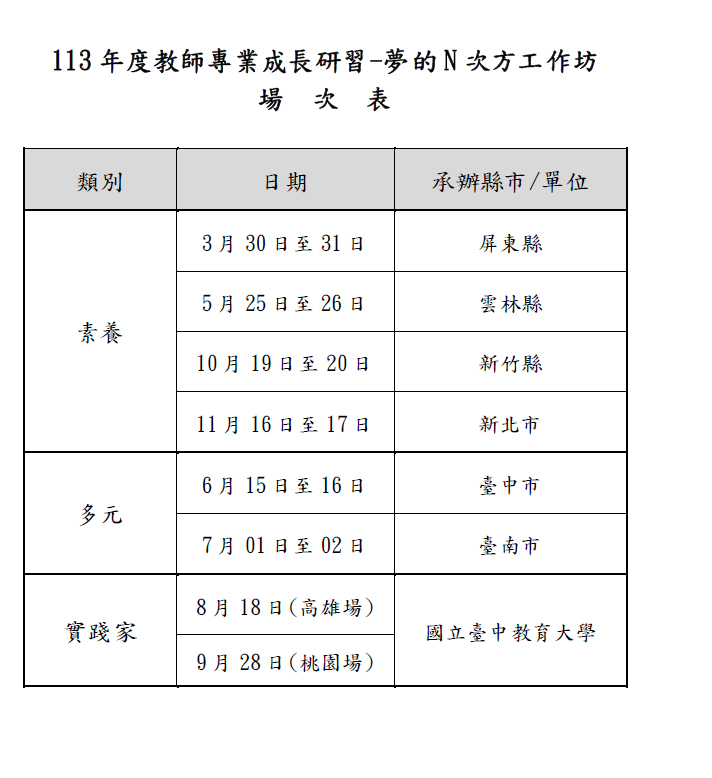 轉知113年度教師專業成長研習-夢的N次方工作坊」場次表,請踴躍報名參加。
