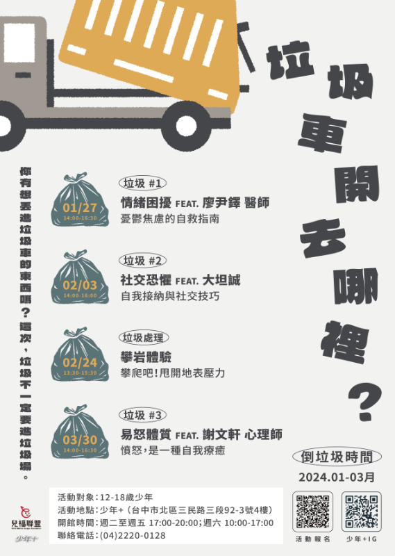 本季規劃「垃圾車開去哪裡?」心理健康主題活動,透過認識情緒困擾、面對社交恐懼、憤怒情緒處理、攀岩運動體驗等活動,期待陪伴少年照顧個人情緒及學習照顧身心。課程及報名資訊詳見活動DM。