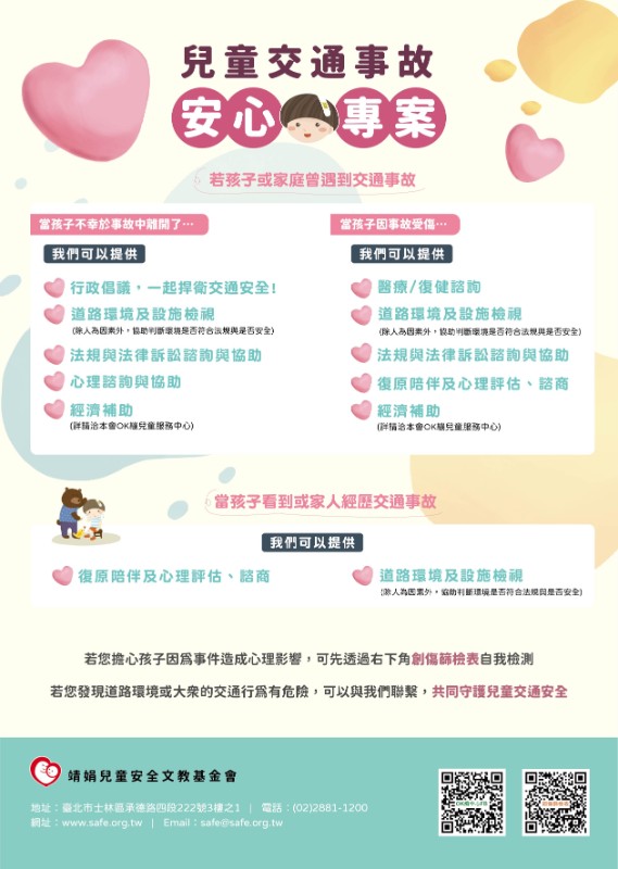 二、為協助兒少及其家庭面對交通事故後之問題及穩定就學,靖娟基金會自110年開辦「兒少交通事故安心專案」,