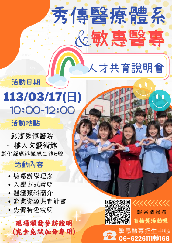 敏惠醫護管理專科學校與秀傳醫療體系舉辦人才共育暨五專入學說明會,敬邀貴校學生、家長報名參加。 |