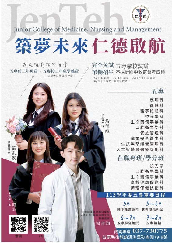 仁德醫護管理專科學校「113學年度完全免試入學單獨招生」資訊 |