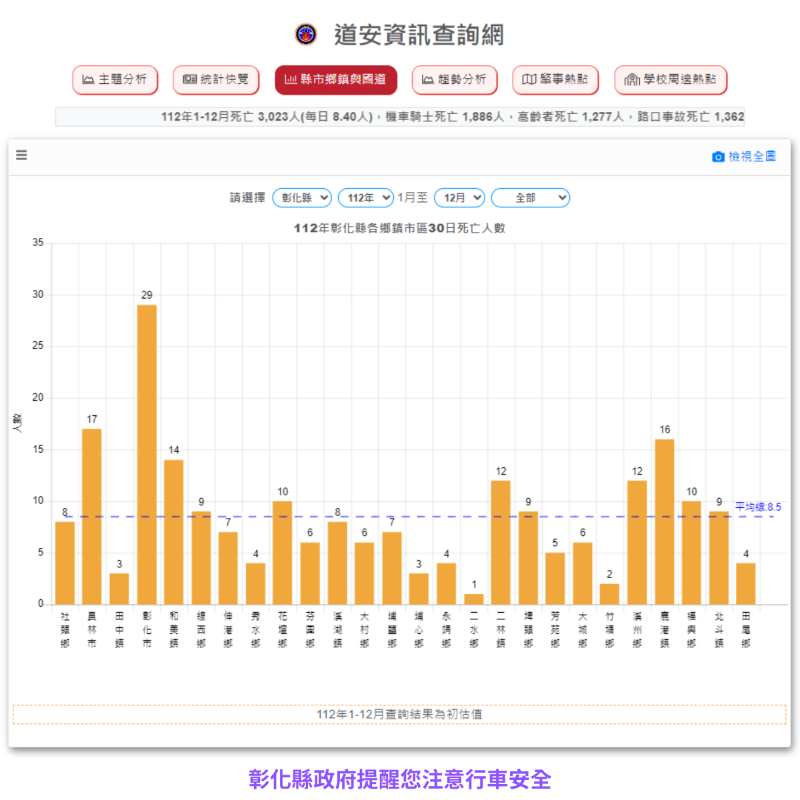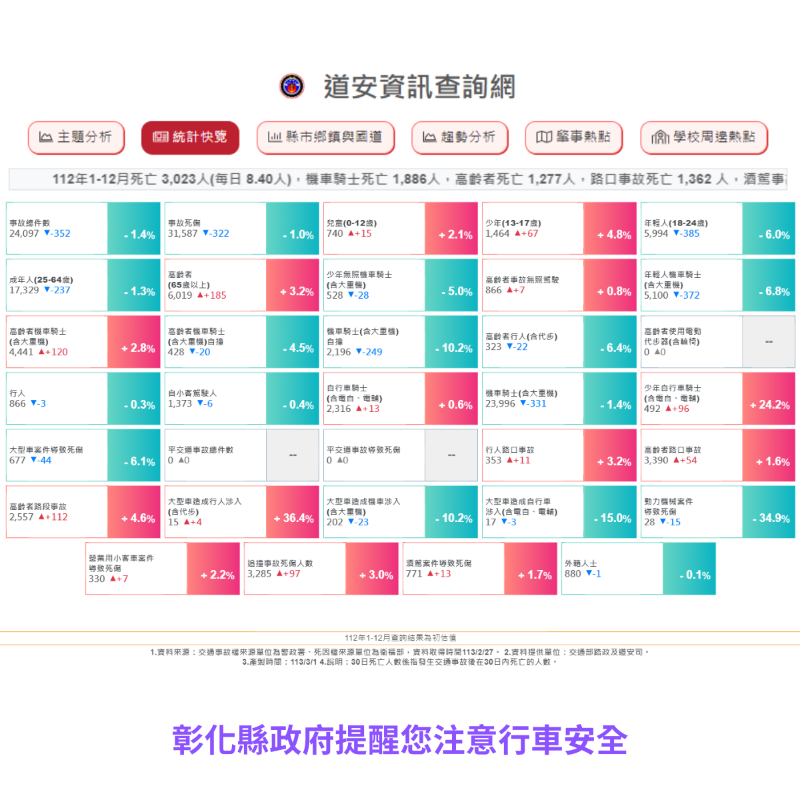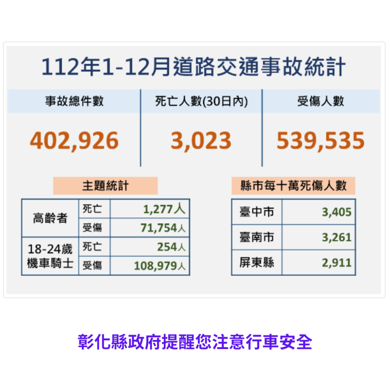 | 標題 | 轉知宣導:本縣112年1-12月道路交通事故死傷累計31,587人。 |