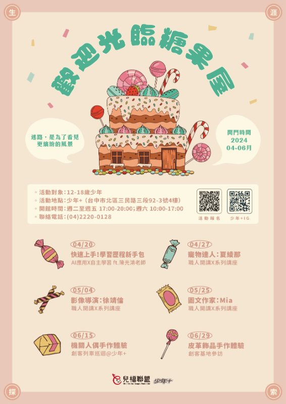 財團法人中華民國兒童福利聯盟文教基金會「少年+」據點2024年4-6月「歡迎光臨糖果屋」生涯探索主題活動宣傳事宜,敬請 貴校協助宣導公告並推薦同學報名參與,不勝感荷。 |
