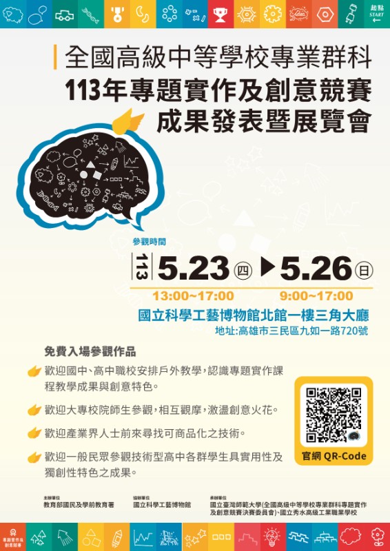 一、依據教育部國民及學前教育署113年5月8日臺教國署高字第1135401582號函辦理。二、旨揭活動係展出全國技術型高中113年專題實作及創意競賽「專題組」及「創意組」15群第1名作品,展現技術型高中學習成果;展示方式包括實體展示及現場解說,由獲獎學生親自說明如何經由作品發揮創意,與日常生活或產業結合。三、本次成果發表暨展覽會資訊:(一)活動時間:1、開放參觀:113年5月23日(星期四)下午1時至113年5月26日(星期日)下午4時。2、成果發表會:113年5月25日(星期五)上午10時。(二)活動地點:國立科學工藝博物館北館1樓三角大廳(高雄市三民區九如一路720號)。四、本次成果發表暨展覽會免費入場,歡迎國、高中學校安排師生前往參觀,亦歡迎學校師生安排團體前往參觀;參加成果發表暨展覽會者,當天可同步免費參觀館內常設展示廳,有意參觀者請於活動當天逕向活動櫃台索取門票入場。五、如對本案活動有疑義,或欲瞭解更多資訊,請逕洽活動聯絡人:張小姐(02-7749-3624、zlin@ntnu.edu.tw)。六、檢附成果發表暨展覽會實施計畫及活動海報各1份。