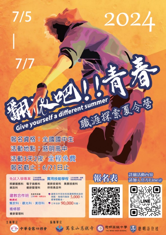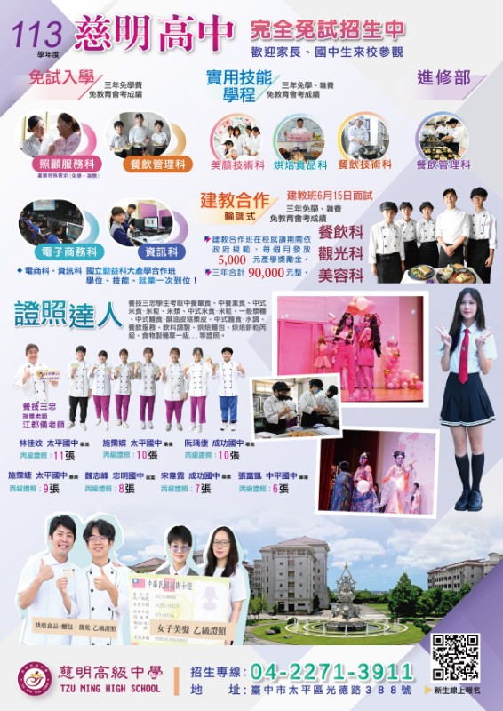 臺中市私立慈明高級中學為提供國中生認識技職內涵及生涯探索,辦理職涯探索夏令營,請協助宣導。