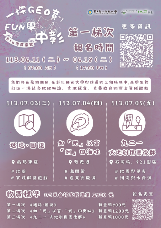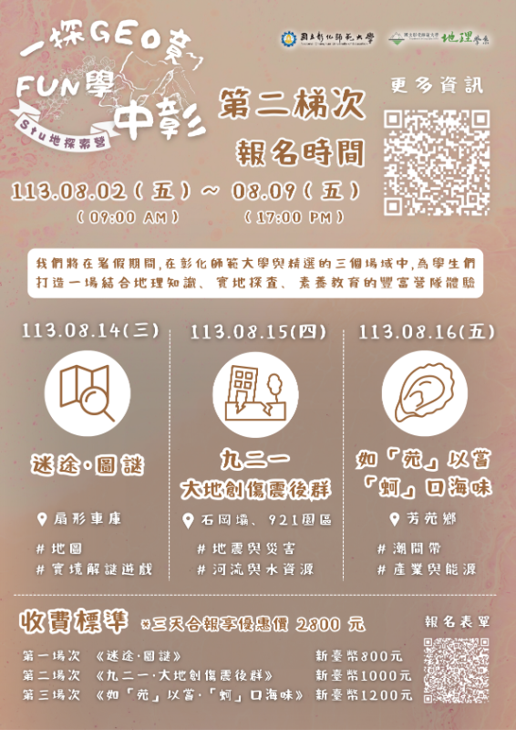 一、舉辦日期 (一)第一梯次:113年07月03日至113年07月05日(星期三、四、五) (二)第二梯次:113年08月14日至113年08月16日(星期三、四、五) 二、報名日期 (一)第一梯次:113年06月11日(二) 09:00至113年06月18日(二) 17:00(額滿為止) (二)第二梯次:113年08月02日(五) 09:00至113年08月09日(五) 17:00(額滿為止) 三、活動海報如附件,活動網站:https://reurl.cc/700V21 四、報名網址 (一)第一梯次:https://reurl.cc/EjgGGk (二)第二梯次:https://reurl.cc/NQbqNp 五、粉絲專頁 (一)FB:第二屆彰師地理探索營 (二)IG:ncue_stu_geo_camp 六、聯絡資訊: 主辦單位:國立彰化師範大學地理學系 活動負責人:黃麒家聯絡 電話:0910345593(以防電話漏接,建議使用Line聯繫)Line ID:0910345503(ID與電話號碼不同) E-mail:ncuegeowintercamp@gmail.com