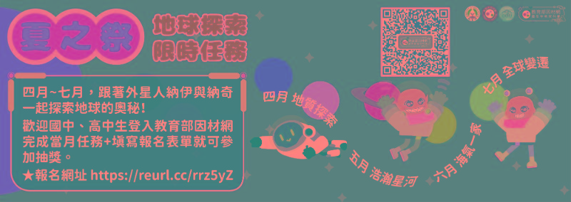 一、依教育部「國高中地球科學領域適性教學教材研發實驗計畫」辦理。二、教育部因材網國高中地球科學數位學習教材以活潑有趣的「探究式對話」引導孩子用科學視角觀察生活中的自然現象,為中學階段學生自主探究學習的優質教材,可做為學生課前預習、課後複習用,亦可做為七、八年級學生以及高中學生自主學習與科展探究學習。為鼓勵學生自主探究與適性學習,促進親、師、生對於教育部因材網之推廣與應用,本年度四月到七月特辦理「夏之祭--地球探索限時任務」跨校學習活動,完成報名之國中、高中職同學即有機會參加科學好禮抽獎,登入說明與報名網址如下:https://reurl.cc/rrz5yZ。三、活動資訊業已公告於因材網網站/最新消息:https://adl.edu.tw/HomePage/news-detail/?Id=103。四、本案聯絡人:國立中央大學網路學習科技研究所莊麗葉小姐,電話03-4227151分機35454。
