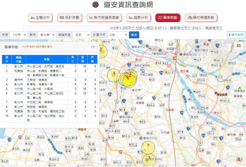 二、根據交通部道安資訊查詢網統計快覽數據跟去年同期比較分析,以動力機械案件導致死傷最高,大型車造成行人涉入(含代步)次之。2月30日死亡人數於「埔鹽鄉」為多,1月死傷情形於「彰化市、員林市、鹿港鎮」較多,另1月肇事熱點以「彰化市」為多,合先敘明。