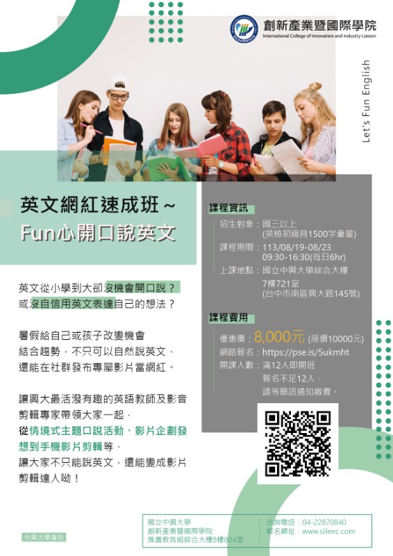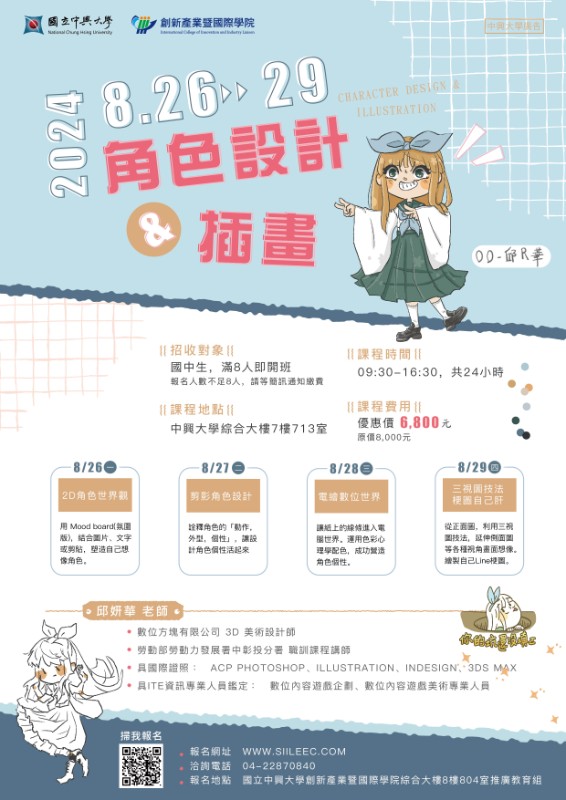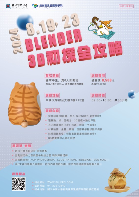 一、本校將於113年7月1日起舉辦旨揭營隊課程,幫助青少年探索自我,多元學習。各營隊特色如下: (一)英文從小學到大卻沒機會開口說?或是沒有自信用英文表達自己的想法?興大規劃《英文網紅速成班~Fun心開口說英文!》5日營,分別策畫從情境式主題口說、影片企劃發想到手機影片剪輯等,協助學生突破對英文的恐懼,能Fun心開口說英文。 (二)對腦海裡總有很多想法,想與世界分享卻無從下手,歡迎加入《角色設計與插畫》。透過創意發想、剪影繪製…等不同技法,逐步賦予想像角色生命吧! (三)想探索 3D 動畫的奧秘嗎?《Blender 3D 初探全攻略》帶你領略強大、好上手、又免費的Blender軟體,讓你創作心中的場景故事吧。 (四)師資由擔任過中興大學語言中心廖秀芬老師,及具備ACP、3ds Max 國際證照、ITE數位內容遊戲美術多張國內外證照邱妍華老師主講,歡迎有興趣學生加入。 二、招生對象:全國公私立國高中職學生,有電腦基礎者。 三、2024年興大營隊資訊如下: (一)英文網紅速成班~Fun心開口說英文!日期:8月19日至8月23日。 (二)Blender 3D 初探全攻略日期︰8月19日至8月23日。 (三)角色設計與插畫日期︰8月26日至8月29日。 (四)地點:國立中興大學綜合大樓教室。 (五)費用請參卓報名網站資訊。 (六)報名方式:請至本校創產學院線上報名系統報名(http://www.siileec.com/index.php?subject_type=38)。至「國立中興大學創新產業暨國際學院線上報名繳費系統」,點選「國高中生研習」加入會員即可報名。 四、聯絡窗口:本校創新產業暨國際學院推廣教育組,電話(04)22870840,詳情請參簡章與海報。