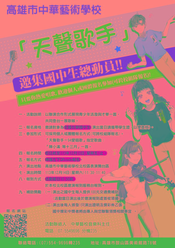 | 標題 | 轉知 中華藝校2024秋季展演「天聲歌手-94愛唱歌」活動 |