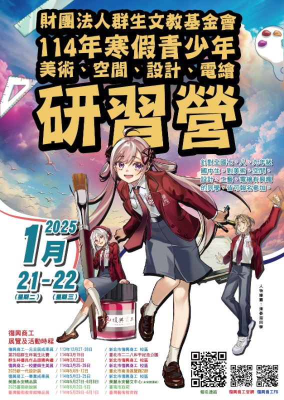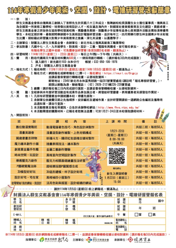 一、研習時間:114年1月21、22日(星期二~星期三)共計兩天。二、研習地點:復興商工。三、參加對象:凡全國國中七、八、九年級,對美術、設計、工藝、電腦有興趣者,皆可報名參加,有報名學生之國中老師,可免費參加研習營(各班別限5名老師,額滿為止)。四、全程參加本次研習活動並有成果作品參加展出者,將發給研習證書,表現優異者頒發佳作獎狀。五、凡參加研習營者,以研習證書申請本校優先錄取。六、報名方式:請填妥網路報名表單及銀行轉帳。 網址:https://reurl.cc/Orgpjy 地址:23451新北市永和區秀朗路一段201號七、報名時間:113年11月01日(星期三)起至114年1月05日(星期五)前,額滿為止。 任何課程相關問題,聯絡電話(02)2926-2121轉226~229。八、報名簡章:如附件。