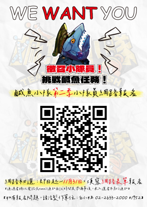 一、本會自製節目【鹹魚小隊】是一檔兒少科普實境節目,主要向民眾推廣正確的災難應變方法以及其中的科學原理,提升青少年災害應對能力以及救難知識。二、本節目以「青少年挑戰災難任務」為主軸,由具備科學專業及救難專業的主持人們,對災難的成因、應對的措施,以自身專業,從不同的角度,進行分析,並和相關領域的專家一同合作,協助青少年理解、習得相關技能,在情境式任務的學習中,掌握相關的知識與技能,進而建立獨立思考、理性分析的科學思維。三、報名時間為2024年10月24日至2024年11月31日。詳細內容及辦法詳見附件。