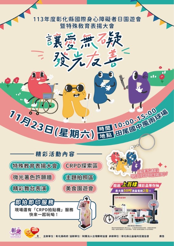| 彰化縣政府府辦理「讓愛無礙 發光友善-113年度彰化縣國際身心障礙者日園遊會暨特殊教育表揚大會」活動EDM 1份,歡迎大家參與。 |
