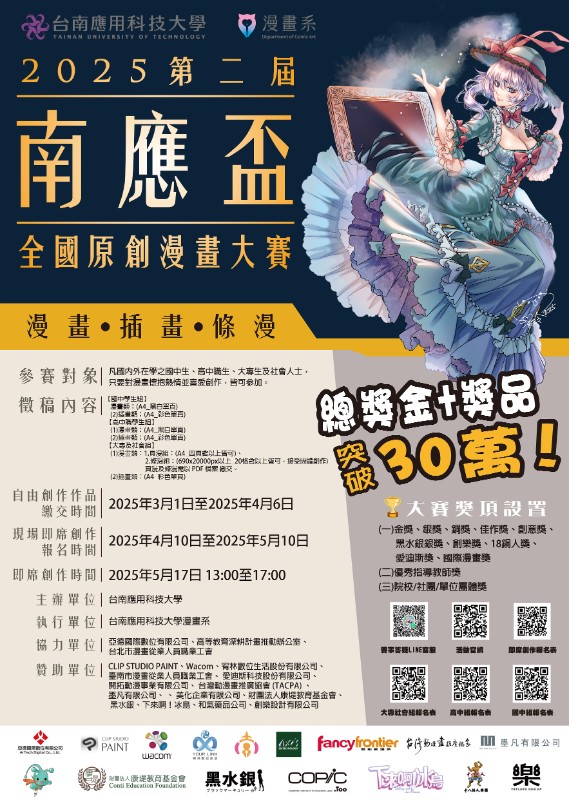 一、活動介紹:南應盃全國原創漫畫大賽旨在推動原創漫畫發展,鼓勵青年創作者的創作熱情,提供展現才華的舞臺。 二、參賽對象:凡國內外在校之國中、高中職學生及大專社會人士,熱愛漫畫且具有創作潛力者均可參賽。 三、徵稿內容及組別: (一)國中學生組:漫畫組及插畫組。 (二)高中職學生組:漫畫組及插畫組。 (三)大專社會組:漫畫組(頁漫組與條漫組)及插畫組。 四、大賽重要時程: (一)自由創作作品繳交日期:2025年3月1日至4月6日。 (二)現場即席創作報名日期:2025年4月10日至5月10日。 (三)頒獎典禮及現場即席創作日期:2025年5月17日。 五、簡章及報名方式:參賽者請上活動官網https://reurl.cc/9vzL8V進行觀看簡章及報名。 六、聯繫與報名連結方式: (一)聯絡單位:本校漫畫系 (二)聯絡電話:TEL:06-2436522(專線)/06-2532106轉314林舜青主任 (三)賽事社群:https://reurl.cc/9vzL8V (四)大專社會組自由創作報名連結:https://forms.gle/HhZMx8AGefvWaWfo7 (五)高中組自由創作報名連結:https://forms.gle/zN3SHsq7drvWtyBt6 (六)國中組自由創作報名連結:https://forms.gle/fVpUQMoMa1jLscmz8 (七)即席創作報名連結:https://www.surveycake.com/s/AapDa