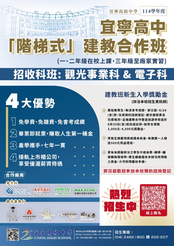 報名方式:採網路(請掃描海報QR Code)報名,或撥打招生專線04-24621800分機202~207;報名截止日為4月14日(星期一)。
