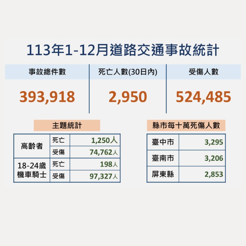 | 標題 | 宣導:本縣113年1-12月道路交通事故死傷累計31,545人。 |