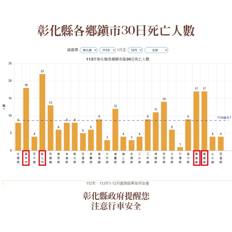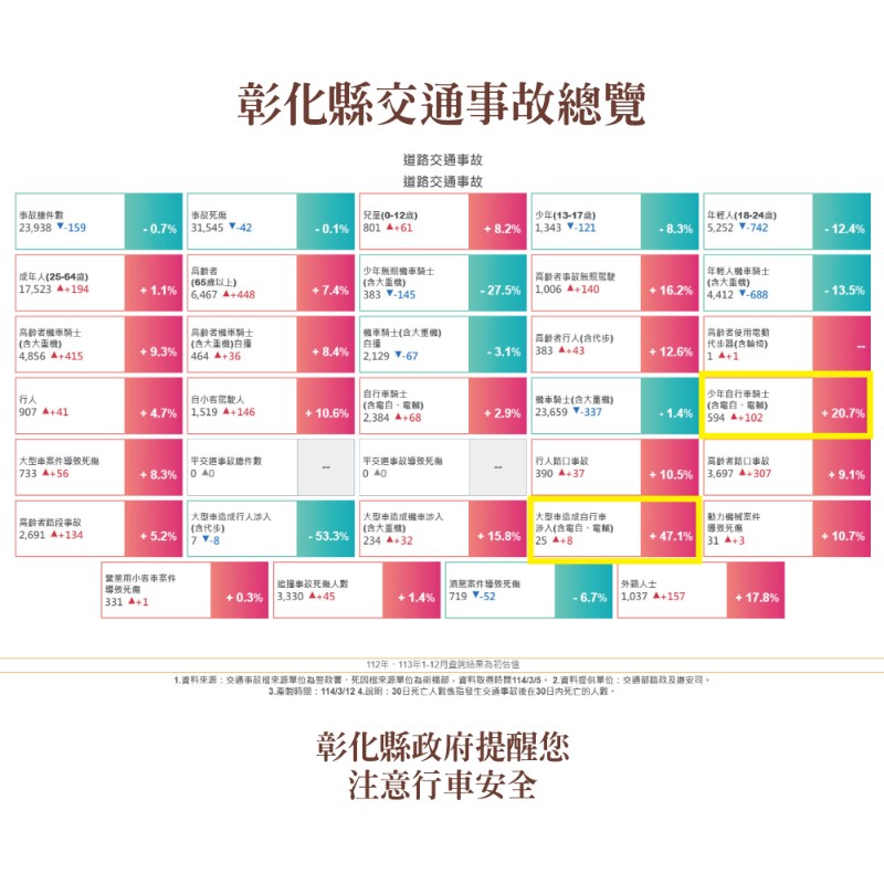 一、宣導內容如下: 二、根據交通部道安資訊查詢網統計快覽數據跟去年同期比較分析,以大型車造成自行車涉入增加最多,少年自行車騎 三、附件為「113年1-12月全國道路交通事故統計、本縣各鄉鎮市30日死亡人數、彰化縣道路交通事故死傷人數及彰化縣肇事熱點」共4份統計資料宣導圖。