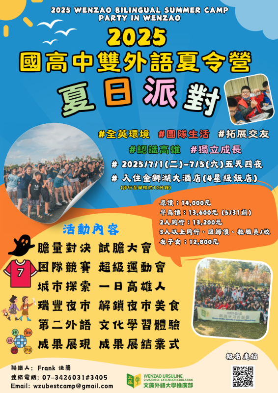 一、時間:民國114年7月1日(二)至7月5日(六),共5天4夜。二、地點:本校及高雄市區。三、活動對象:國中一至三年級學生、高中職一至三年級學生。四、活動人數:100人/梯次,額滿為止。五、詳情可至本校推廣部網頁查詢:https://dee.wzu.edu.tw/Course/3841,或洽專線(07)3458212。