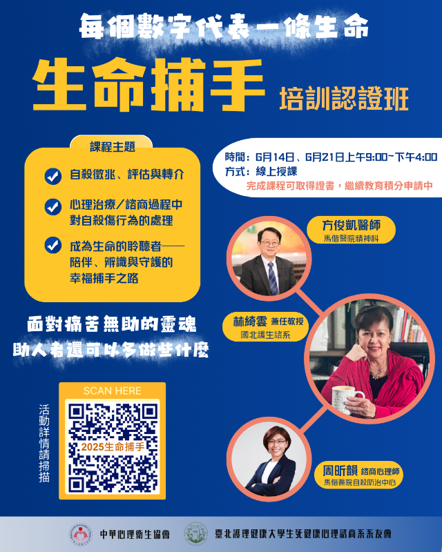 社團法人中華心理衛生協會與臺北護理健康大學生死與健康心理諮商系系友會共同辦理「生命捕手培訓認證班」,歡迎踴躍報名參加,並惠予公(差)假登記。