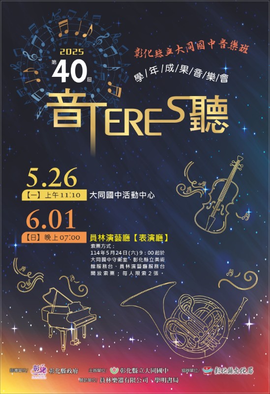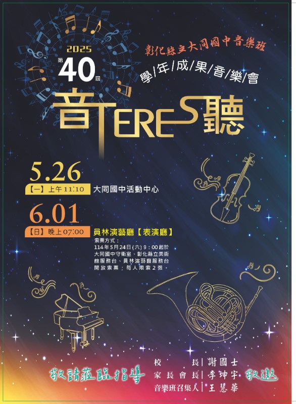 一、旨揭成果音樂會主題為「音teres聽」,以室內樂、合奏、合唱等方式呈現本屆音樂班學年成果。二、時間:114年6月1日(星期日)19:00-21:00,18:30入場。三、地點:員林演藝廳-表演廳。四、檢附音樂會海報電子檔、邀請卡電子檔各一份。