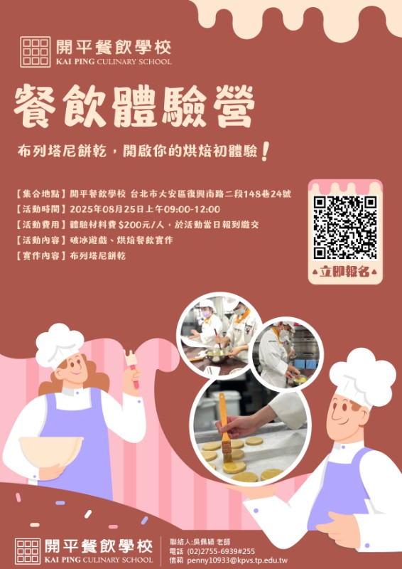 一、為協助國中生認識技職體系之學習內容、教學特色及進路發展,本次活動為透過餐飲實作體驗更加了解技職教育,以料理展現自我、創造未來無限可能。二、辦理活動日期:114年08月25日(一)09:00–12:00-烘焙。三、活動對象:全國國中同學。四、活動人數:30位。五、報名方式:採線上報名,報名連結:https://reurl.cc/74kLyk,報名成功週五統一會發送簡訊通知。六、活動地點:臺北市大安區復興南路二段148巷24號_開平餐飲學校102室報到。七、活動詳細內容請參閱實施計畫,有相關事宜,歡迎洽詢2755-6939轉255,吳老師。