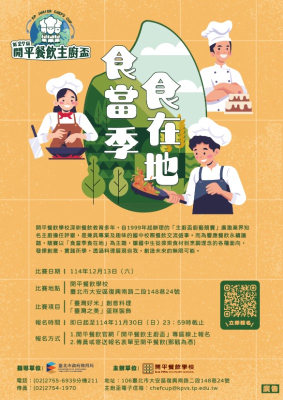 一、開平餐飲學校長年致力於推展餐飲專業教育,啟蒙對餐飲有興趣的學生,讓餐飲文化能向下紮根。自西元1999年起,由開平餐飲師生共同舉辦的「主廚盃餐飲競賽」,已成為國中校際餐飲交流的年度盛事。本次主題是「食當季食在地」,旨在響應現代社會對永續發展和健康生活的追求,希望透過此次活動,讓孩子們開始探索食材選擇到烹調理念的各種面向,並發揮創意實踐所學,透過料理展現自我,創造未來的無限可能。二、本屆比賽類別(一)「臺灣好米」創意料理(二)「臺灣之美」蛋糕裝飾三、報名日期:即日起至114年11月30日(星期日)截止四、比賽日期:114年12月13日(星期六)五、比賽地點:開平餐飲學校(106台北市大安區復興南路二段148巷24號)六、檢附旨案賽事比賽辦法、EDM及報名表各1份。七、旨揭競賽活動紙本海報將另行寄送,屆時敬請貴校、貴機關協助張貼宣導