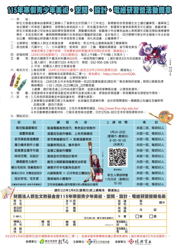 一、研習時間:115年1月24、25日(六~日)共計兩天。二、研習地點:復興商工。三、參加對象:凡全國國中七、八、九年級,對美術、設計、工藝、電腦有興趣者,皆可報名參加,有報名學生之國中老師,可免費參加研習營(各班別限5名老師,額滿為止)。四、全程參加本次研習活動並有成果作品參加展出者,將發給研習證書,表現優異者頒發佳作獎狀。五、凡參加研習營者,以研習證書申請本校優先錄取。六、報名方式:請填妥網路報名簡章及銀行轉帳。 網址:https://reurl.cc/LnGQ6L 地址:23451新北市永和區秀朗路一段201號七、報名時間:114年11月01日(星期六)起至115年1月04日(星期日)前,額滿為止。 任何課程相關問題,聯絡電話(02)2926-2121轉226~229。八、報名簡章:如附件。