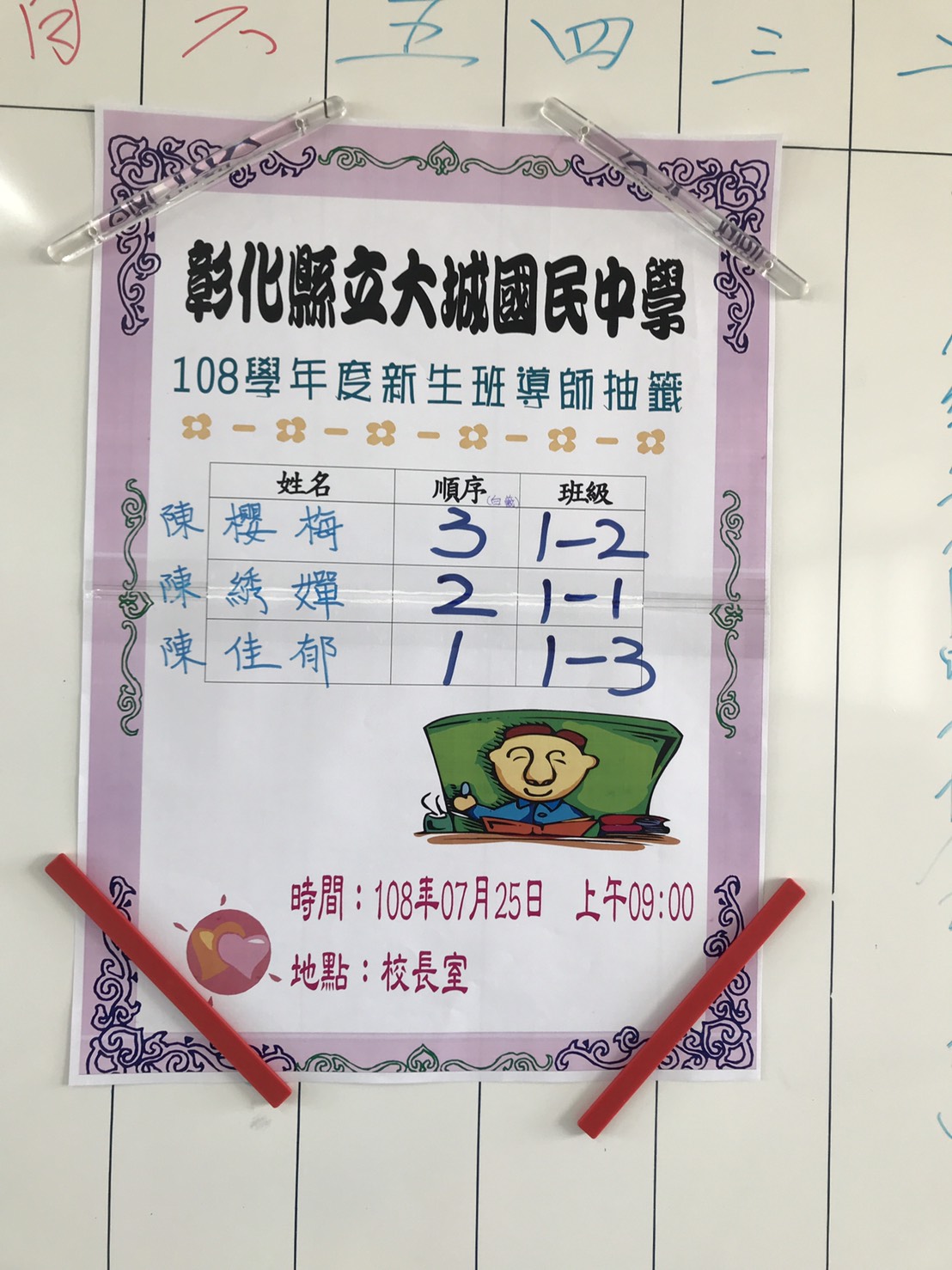 | 標題 | 彰化縣立大城國民中學108學年度新生導師抽籤順序結果 |