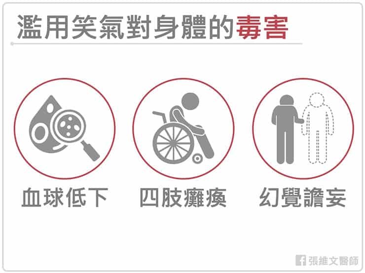過量吸食笑氣,會對身體造成缺氧之直接傷害,可能導致昏迷、甚至死亡。