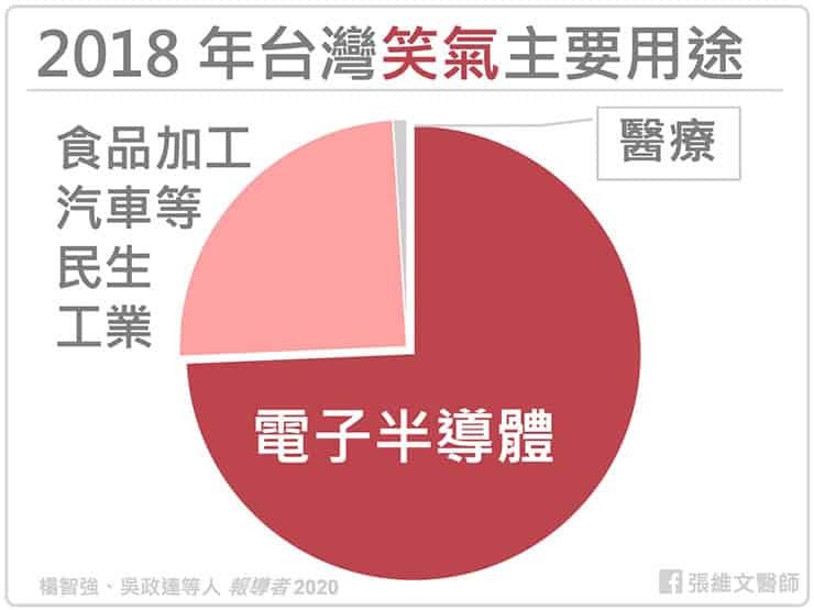 工業用途,以半導體產業的需求為大宗,製作晶圓積體電路板時會大量運用此氣體;此外,生產汽車 PCV 系統與引擎助燃劑等工業也會用到。年輕人恐不慎墜入笑氣濫用的陷阱