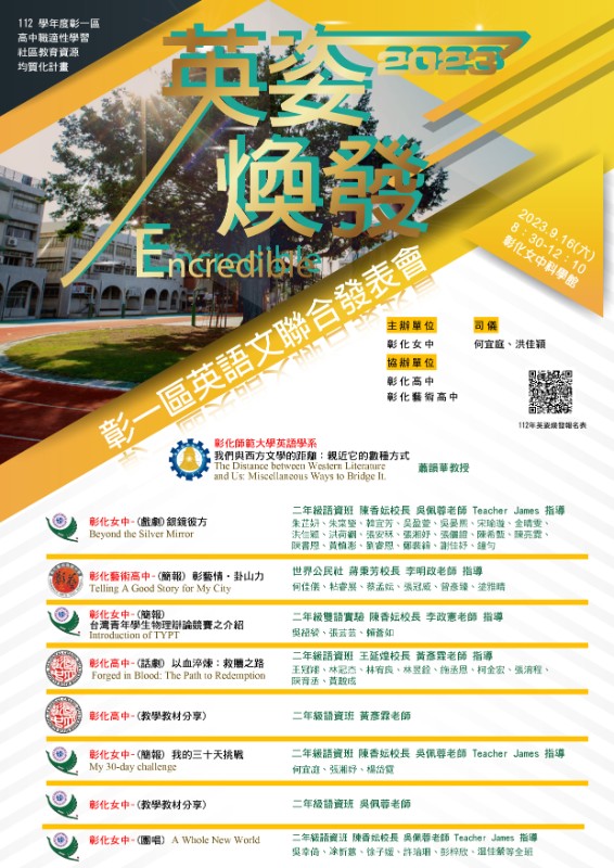 本次「英姿煥發—彰一區英語文聯合發表會」活動由彰化高中、彰化藝術高中與本校合作辦理,敬邀三校校長及師長參加。 |